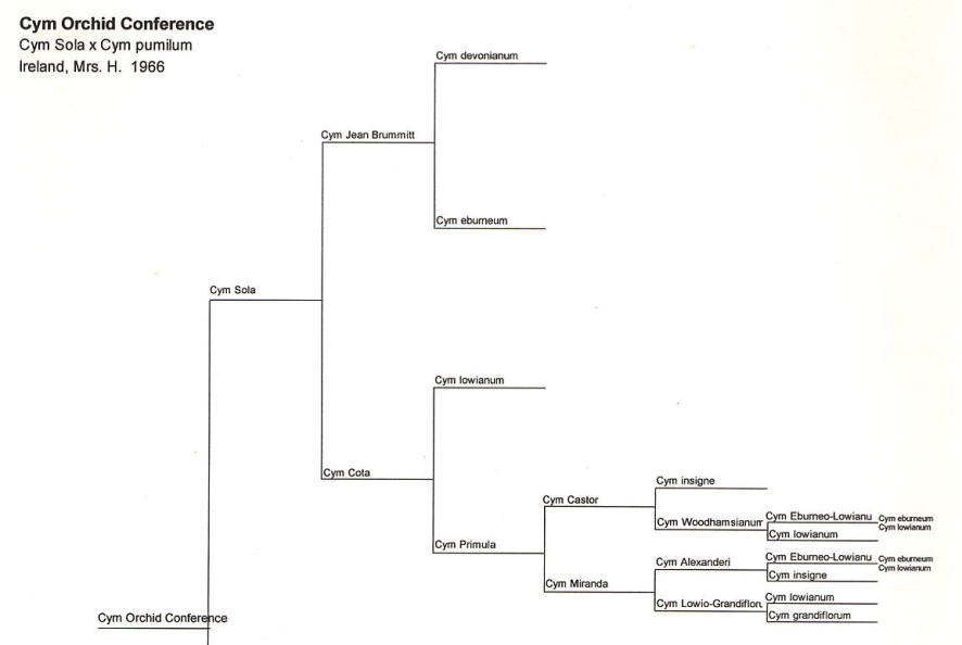 遺伝子から見ると下垂原種のdevonianumと小型Cymのpumilumで出来ている。RHS登録1966年。米国の多様なCym交配の黄金時代になされた交配で、このような花を見ると米国の自由な、深く高い好奇心をうかがうことが出来る。彼女の素晴らしい情熱を見ることが出来る。この個体は、第五回世界ラン会議でゴールドメダルを獲得した銘花である。大型シンビの展示の中で、小型のこの品種が栄光に輝いた。シンビに新たな分野と可能性を示したのである。現在の下垂ブームの源流にこの品種が存在し、しかも、それを作ったのが女性であった。Mrs,H,Irelanndの名は伝説である。