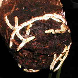 この栽培法では、東洋ラン鉢の細長い鉢に植えても、根は鉢の上部半分に伸びます。