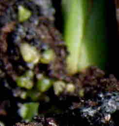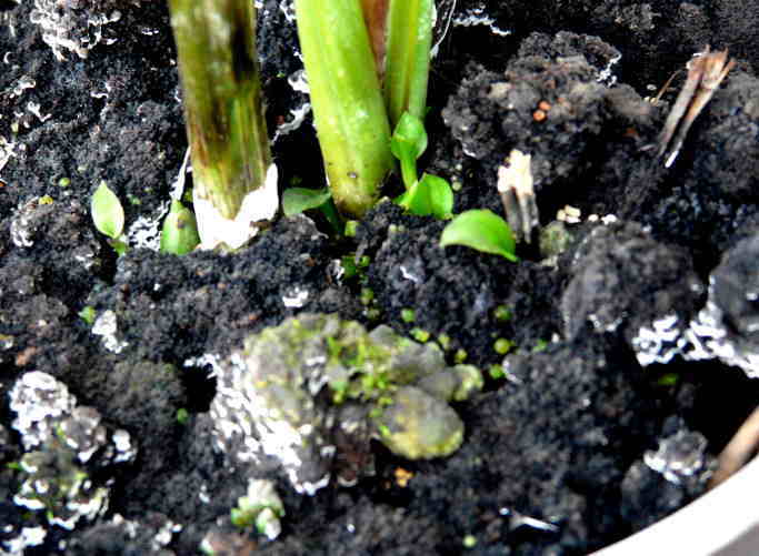 ニオイエビネ「霧の香り」SUGOI-ne1号植え、親鉢の表面に多数のプロトコームが発生。 一部のものは発芽している。