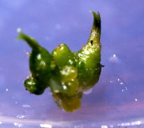固形培地ではPLBの切片は約1ケ月でPLBになる。このまま培養を続けると発芽し小苗に生長する。大量増殖の場合はカットを1ケ月に一度の割で行わなければならない。