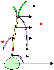 下の図のように暗所培養の場合は茎が長く伸びて、節が出来ます。数節出来ることもあります。この節々から根が出る場合があります。