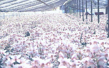 プロの鉢物生産の場合は、フラスコより出してから3−4年、胡蝶蘭と同じような高温で暖房して栄養生長期間を長くして葉の枚数を確保して山上げしております。一鉢に何本も花が立っているのはそのためです。